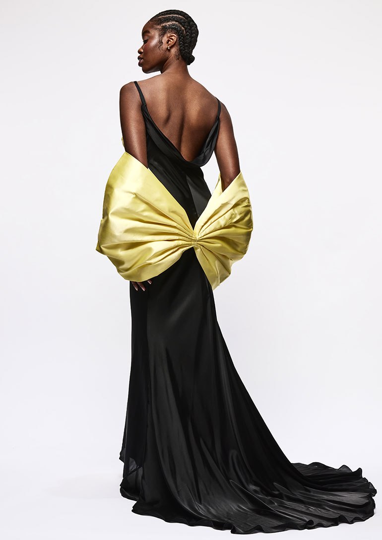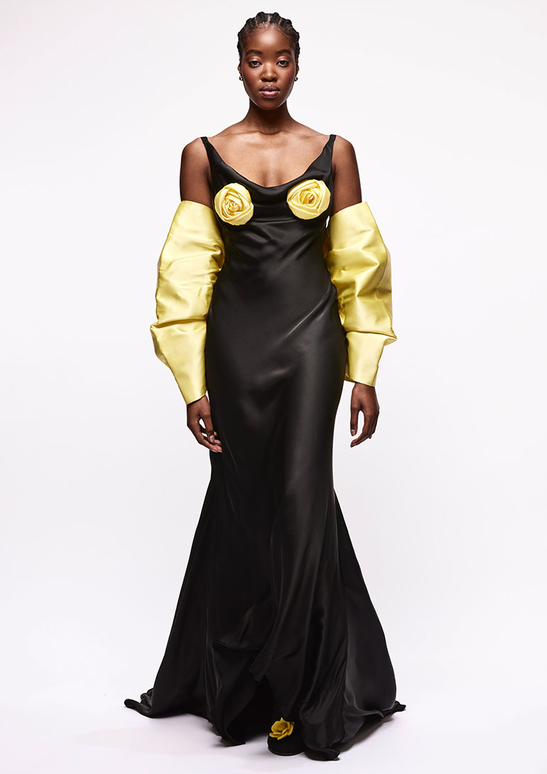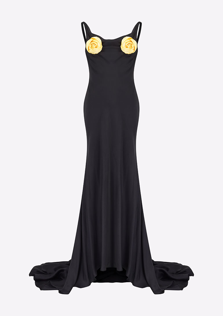 Vegan Bias Cut Gown in Black with Yellow Rosette