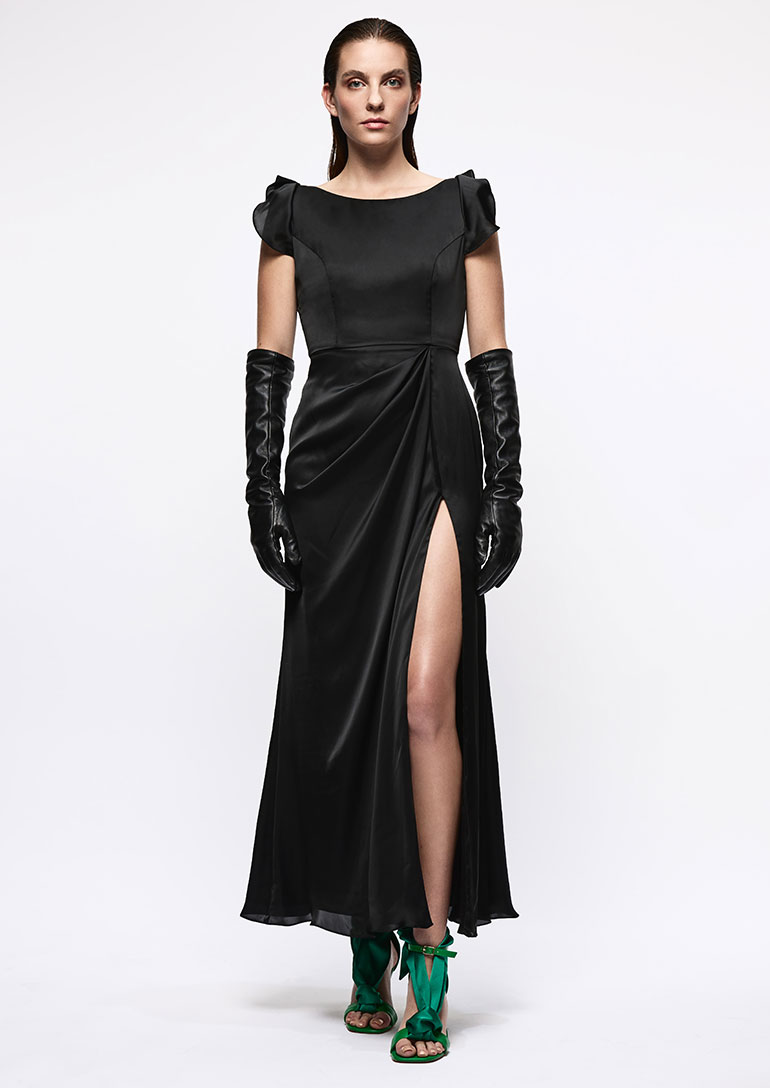 •     Cap sleeves, ruching with side slit
